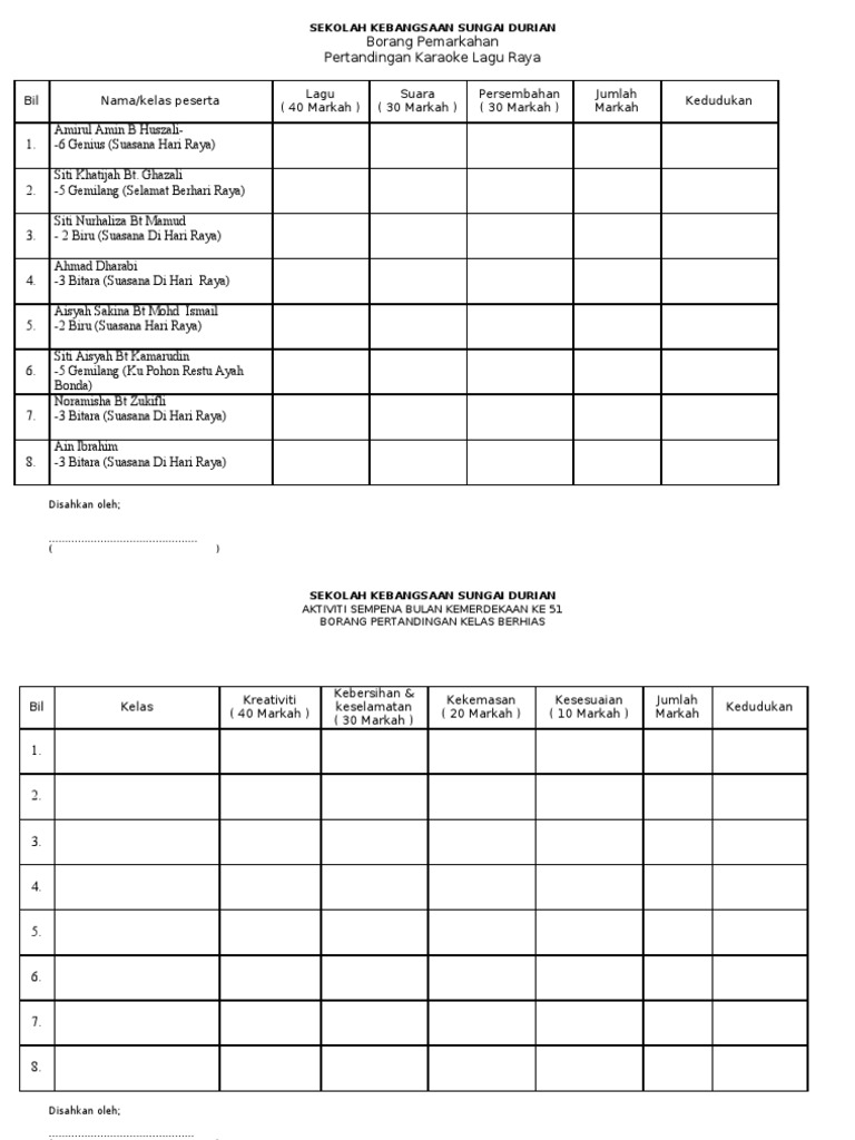 KEMENTERIAN PENDIDIKAN MALAYSIA Giliran. Borang Pemarkahan Pertandingan Kawad Kaki SISPA Hanya untuk Hakim Sahaja 2 11 A Markah Peratus 10 Markah Penuh Persediaan. BORANG PEMARKAHANPERTANDINGAN SYARAHANGiliran PesertaKategori.